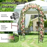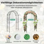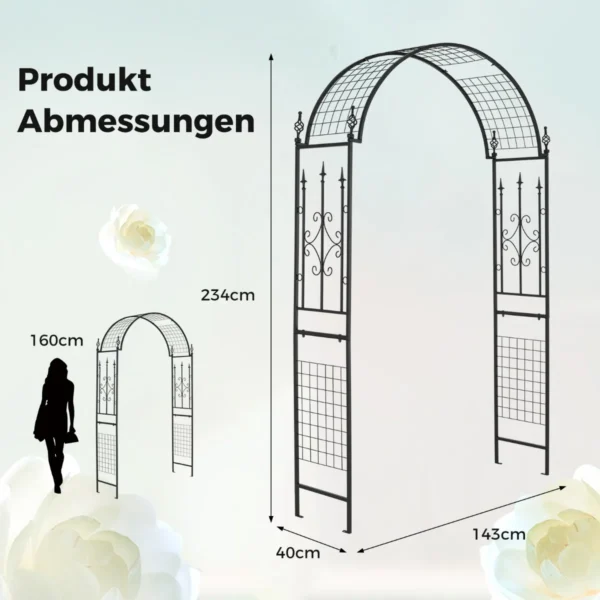 Gėlių arka 143x40x234 cm juodos spalvos yra funkcionali lauko dekoracija, kuri tinka vijoklinių augalų auginimui ir įvairių renginių papuošimui. Metalinis rėmas su keturiais įžemintais kuolais užtikrina stabilumą ir ilgaamžiškumą.
