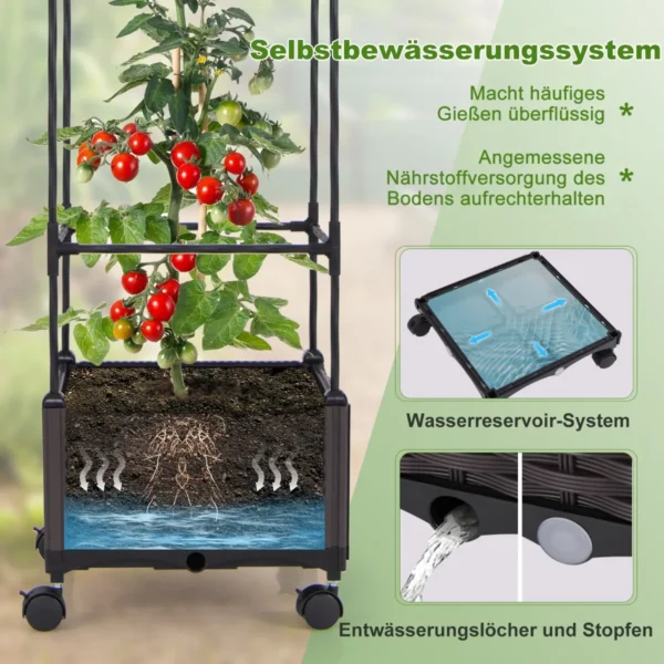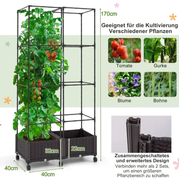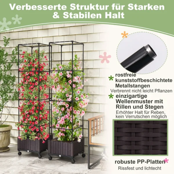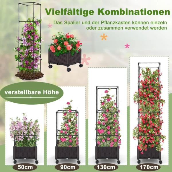 Gėlių dėžė su grotelėmis 40x40x170 cm yra praktiškas sprendimas augalų auginimui tiek lauke, tiek viduje. Tamsiai rudos ir juodos spalvų derinys dera prie įvairių aplinkų, o reguliuojamas grotelių aukštis leidžia pritaikyti dėžę skirtingiems vijokliniams augalams.