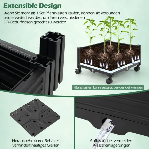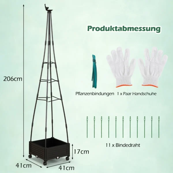 Gėlių dėžė su grotelėmis 41x41x206 cm, juodos spalvos – praktiškas sprendimas vijokliniams augalams ir daržovėms auginti. Pagaminta iš atsparios PE dengto metalo ir patvarios PP medžiagos, ši dėžė užtikrina ilgalaikį naudojimą tiek lauke, tiek viduje.