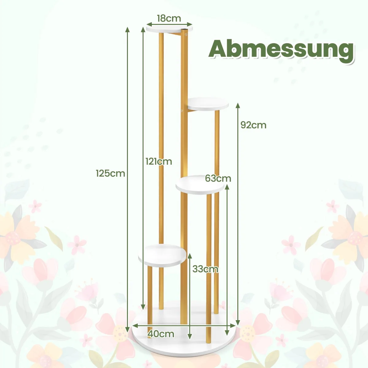Gėlių stovas 40x40x125cm auksinės ir baltos spalvos – praktiškas sprendimas patalpų dekoravimui ir erdvės organizavimui. Keturių pakopų metalinis stovas puikiai tinka vazoniniams augalams, suteikia galimybę efektyviai išnaudoti kampinę erdvę bei papildo interjerą.