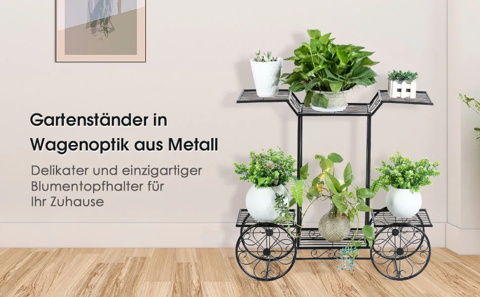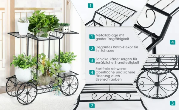 Gėlių stovas 80,5x25x75cm, juodos spalvos, skirtas įvairių augalų ir dekoracijų laikymui bei eksponavimui tiek namų viduje, tiek lauke. Metalinė konstrukcija užtikrina patvarumą, o kompaktiškas dydis leidžia efektyviai išnaudoti vietą balkone, terasoje ar sode.