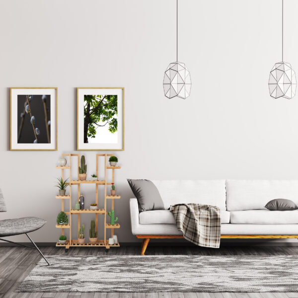 Šis gėlių stovas ne tik suteikia pakankamai vietos jūsų augalams, bet ir padeda sukurti harmoningą ir natūralų interjero dizainą. Nesvarbu, ar norite eksponuoti gėlių vazonus, džiovintas gėles ar kitus dekoratyvinius daiktus, šis stovas puikiai tiks tiek svetainėje, tiek miegamajame.