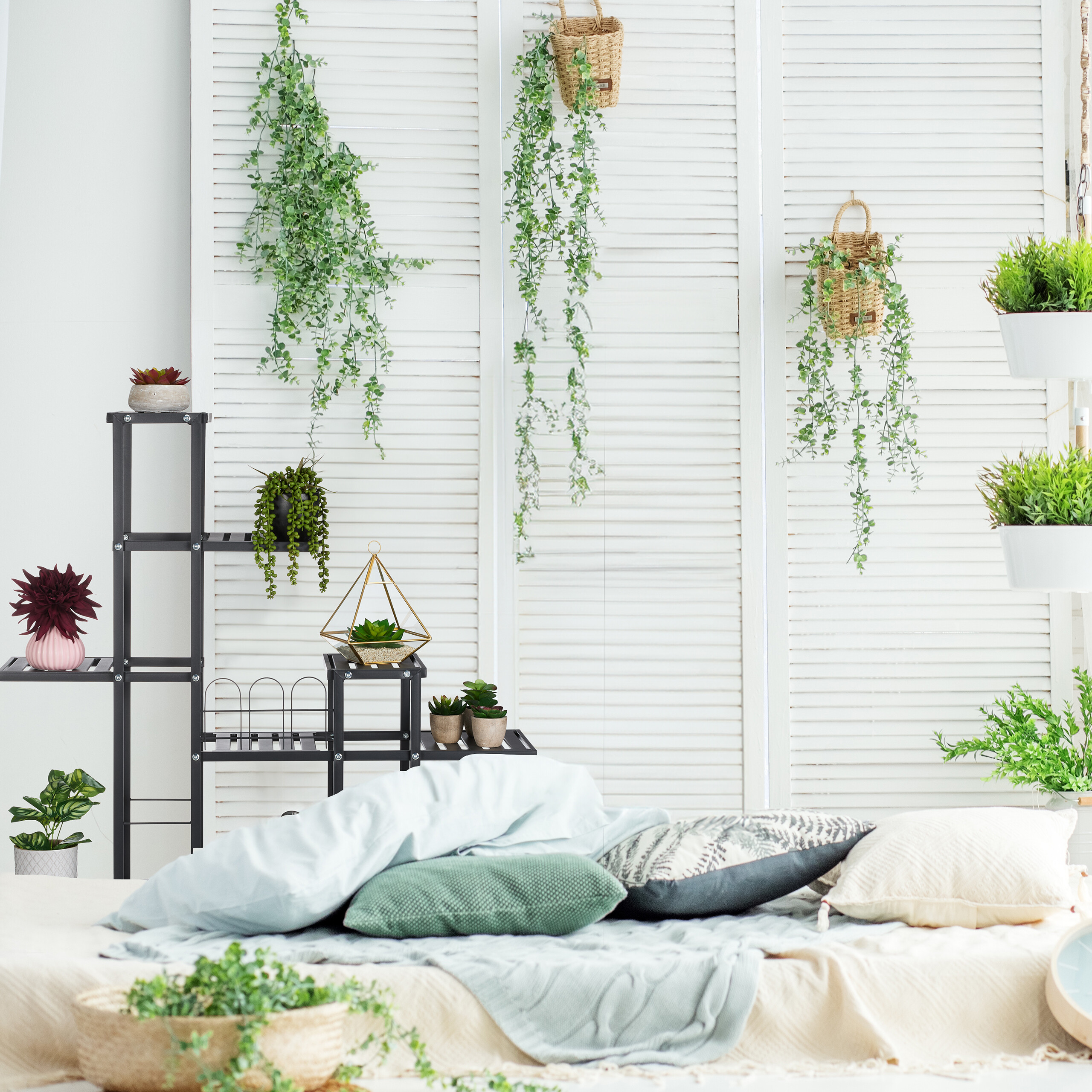 - Didelė talpa: 9 lentynos suteikia pakankamai vietos įvairiems augalams, gėlių vazonams, džiovintoms gėlėms ar dekoratyviniams daiktams.