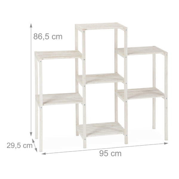 Pristatome jums baltos spalvos gėlių stovą su 7 lentynomis, kurio matmenys yra 86,5x95x29,5 cm. Šis stovas yra puikus pasirinkimas tiems, kurie nori suteikti savo namams natūralaus žavesio ir elegancijos. Tai ne tik praktiškas, bet ir estetiškas sprendimas jūsų augalams ir dekoracijoms.