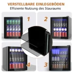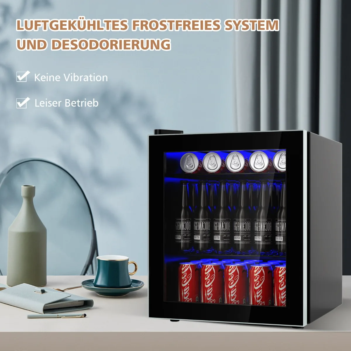 Gėrimų šaldytuvas 44,5×46,5×50 cm, juodos spalvos, skirtas efektyviam įvairių gėrimų atšaldymui. Kompaktiškas ir nešiojamas įrenginys, tinkantis naudoti tiek namuose, tiek biure ar žaidimų kambariuose. Skaidrios dvigubo stiklo durelės leidžia lengvai matyti viduje esančius produktus.