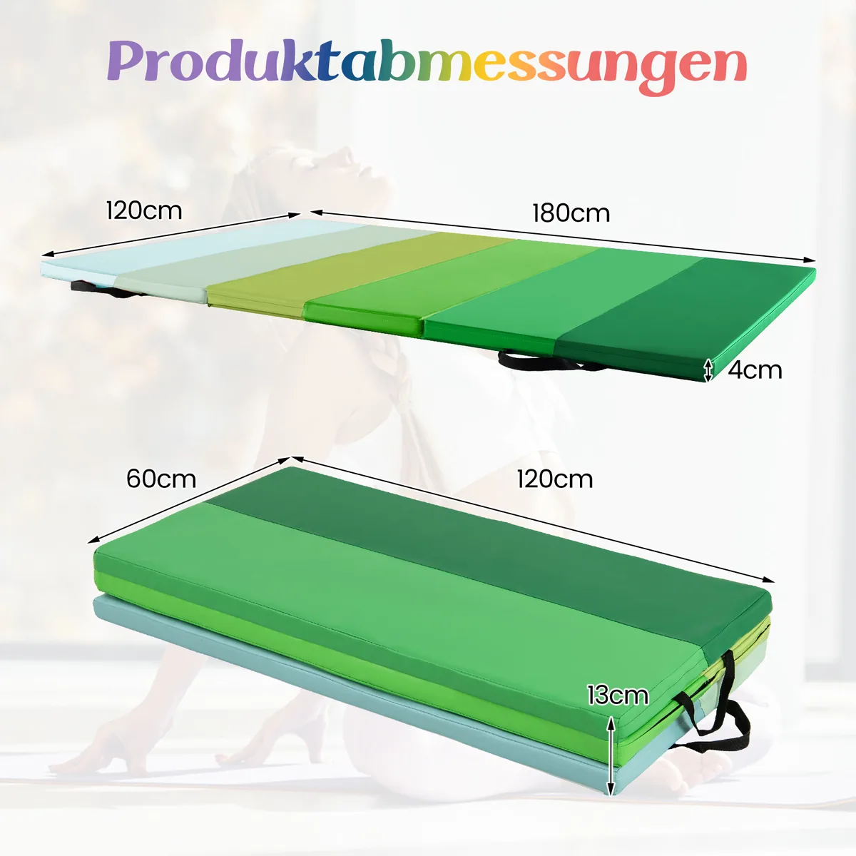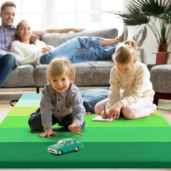 Gimnastikos kilimėlis 180x120x3 cm žalios spalvos skirtas įvairiems sporto ir laisvalaikio užsiėmimams. Sulankstomas ir lengvai nešiojamas kilimėlis tinka gimnastikai, jogai, tempimui bei vaikų žaidimams. Dėl savo storio ir medžiagos užtikrina komfortą ir saugumą treniruočių metu.