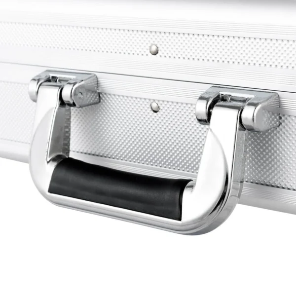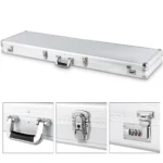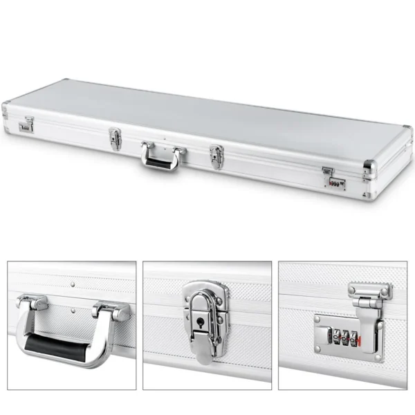 Ginklo dėklas sidabrinės ir juodos spalvos, pagamintas iš tvirto aliuminio rėmo, skirtas saugiai ir patogiai laikyti bei transportuoti įvairius ginklus. Dėklas turi reguliuojamą putplasčio įdėklą, kuris užtikrina apsaugą nuo smūgių ir prisitaiko prie skirtingų ginklų formų.