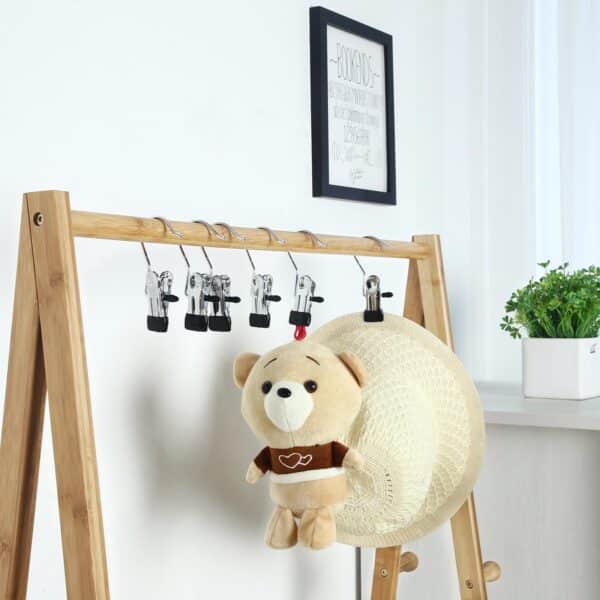 SONGMICS chromuotas metalinis spaustukas – patogus ir tvirtas sprendimas, palengvinantis jūsų kasdienį gyvenimą. Tvarkingai sutvarkykite kojines, kepures, apatinius, kaklaraiščius, pirštines, batus, rankšluosčius ir kitus smulkius daiktus. Ne tik suknelės, sijonai, palaidinės, marškiniai ir švarkai gali būti pakabinti, bet ir smulkūs kasdieniai daiktai, tokie kaip šalikai ar kojinės, randa vietą ant SONGMICS segtukų kabliukų, skirtų saugojimui ar skalbinių džiovinimui.