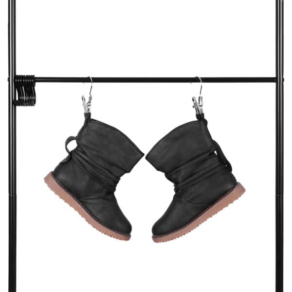 Šie segtukai taip pat puikiai tinka batų pakabinimui, kad nuvalytumėte grindis. Viskas pakimba tvarkingai, o batai nebėra susiraukšlėję. Gumuoti klipai apsaugo nuo odos pažeidimų, o kompaktiškas dizainas leidžia juos lengvai pritaikyti bet kuriame koridoriuje, duryse ar spintoje. SONGMICS drabužių kabykla su segtuku tikrai taps jūsų šeimos patogiu pagalbininku.