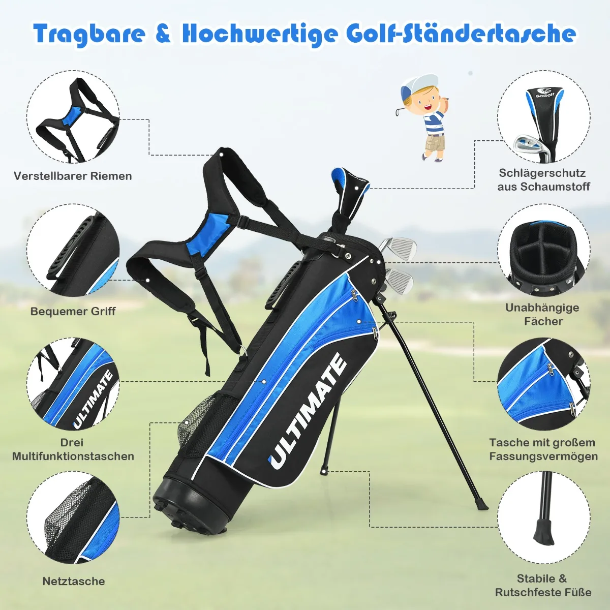 Golfo krepšys 20x14x90cm juodos ir mėlynos spalvų kombinacijoje skirtas vaikams, pradedantiesiems golfo žaidėjams. Komplekte rasite būtiną įrangą, leidžiančią įgyti pirmąją golfo patirtį ir ugdyti įgūdžius žaidžiant įvairiais klubais.