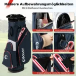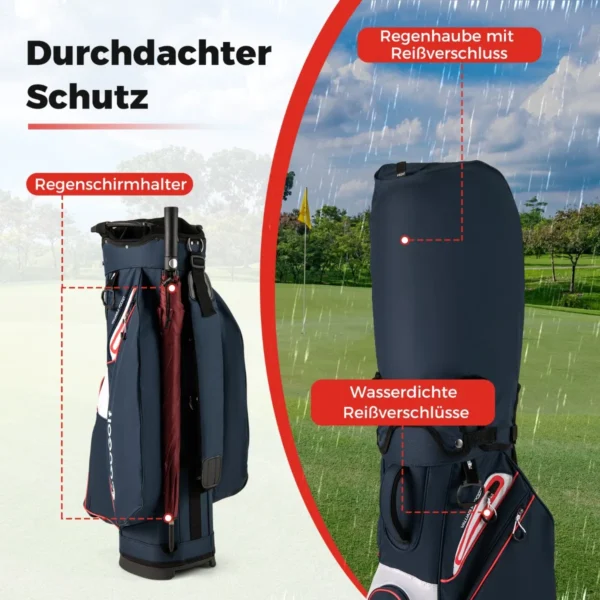 Golfo krepšys 32x26x126,5 cm, tamsiai mėlynos spalvos, skirtas patogiam golfo lazdų nešiojimui ir saugojimui. Krepšyje yra 14 krypčių padalintas viršus ir daug įvairių kišenių, užtikrinančių pakankamai vietos golfo reikmenims bei asmeniniams daiktams. Atsparios medžiagos ir apsauga nuo lietaus padeda išlaikyti įrangą sausą įvairiomis oro sąlygomis.