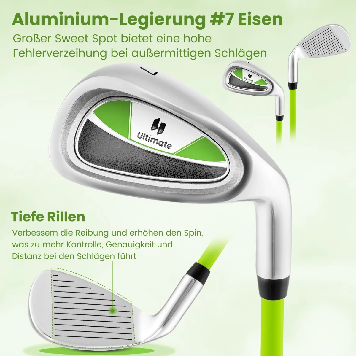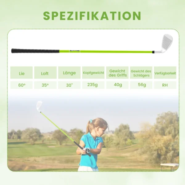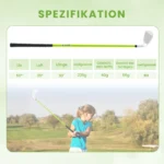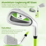 Golfo lazda 76cm., žalios/sidabrinės spalvos skirta jauniesiems golfo žaidėjams nuo 8 iki 10 metų. Šis Nr. 7 lygintuvas pasižymi aliuminio lydinio galvute, stiklo pluošto kotu ir ergonomiška guma rankena, suteikiančia komfortą ir patikimą valdymą žaidimo metu.