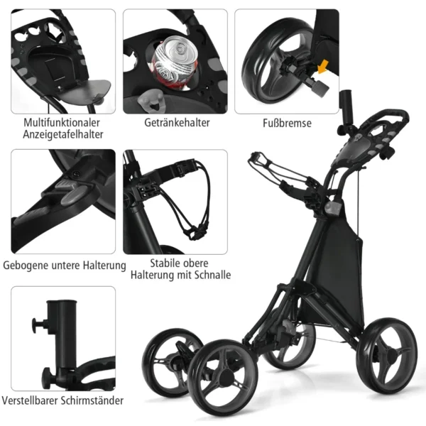Golfo vežimėlis 110x100x65cm, juodos ir pilkos spalvos, yra patogus ir funkcionalus įrenginys golfo krepšių ir įrangos transportavimui. Vežimėlis tinka naudoti įvairių dydžių golfo krepšiams ir užtikrina stabilų važiavimą įvairiu reljefu. Dėl sulankstomo dizaino ir reguliuojamos rankenos šis golfo vežimėlis atitinka skirtingų vartotojų poreikius.
