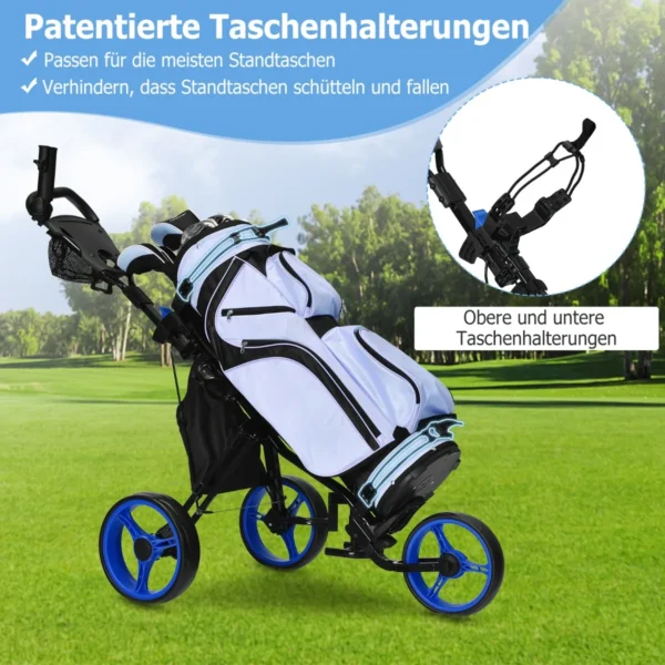 Golfo vežimėlis 129,5x75x119,5 cm, juodos ir mėlynos spalvos, skirtas patogiai golfo krepšių transportavimui. Lengvas ir tvirtas plieninis rėmas bei reguliuojama rankena užtikrina komfortą tiek paaugliams, tiek suaugusiems. Vežimėlyje yra papildomos laikymo vietos, skėtis nuo saulės ir patvarūs ratai, pritaikyti įvairioms golfo aikštelės sąlygoms.