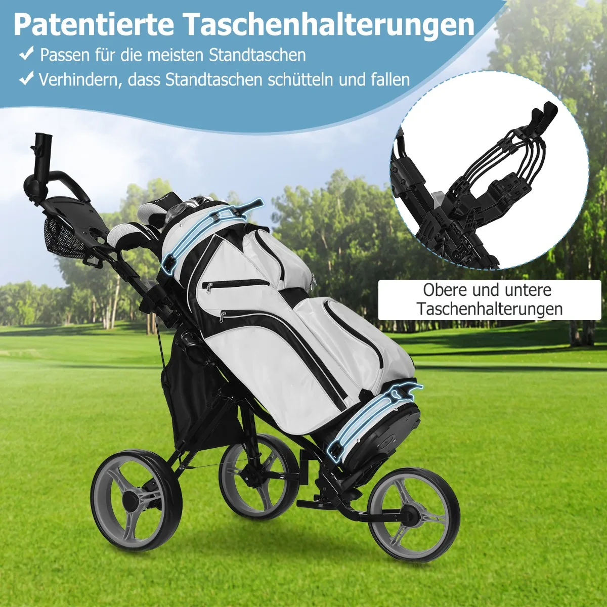 - Lengvas, tačiau tvirtas plieninis rėmas pritaikytas įvairaus dydžio golfo krepšiams.