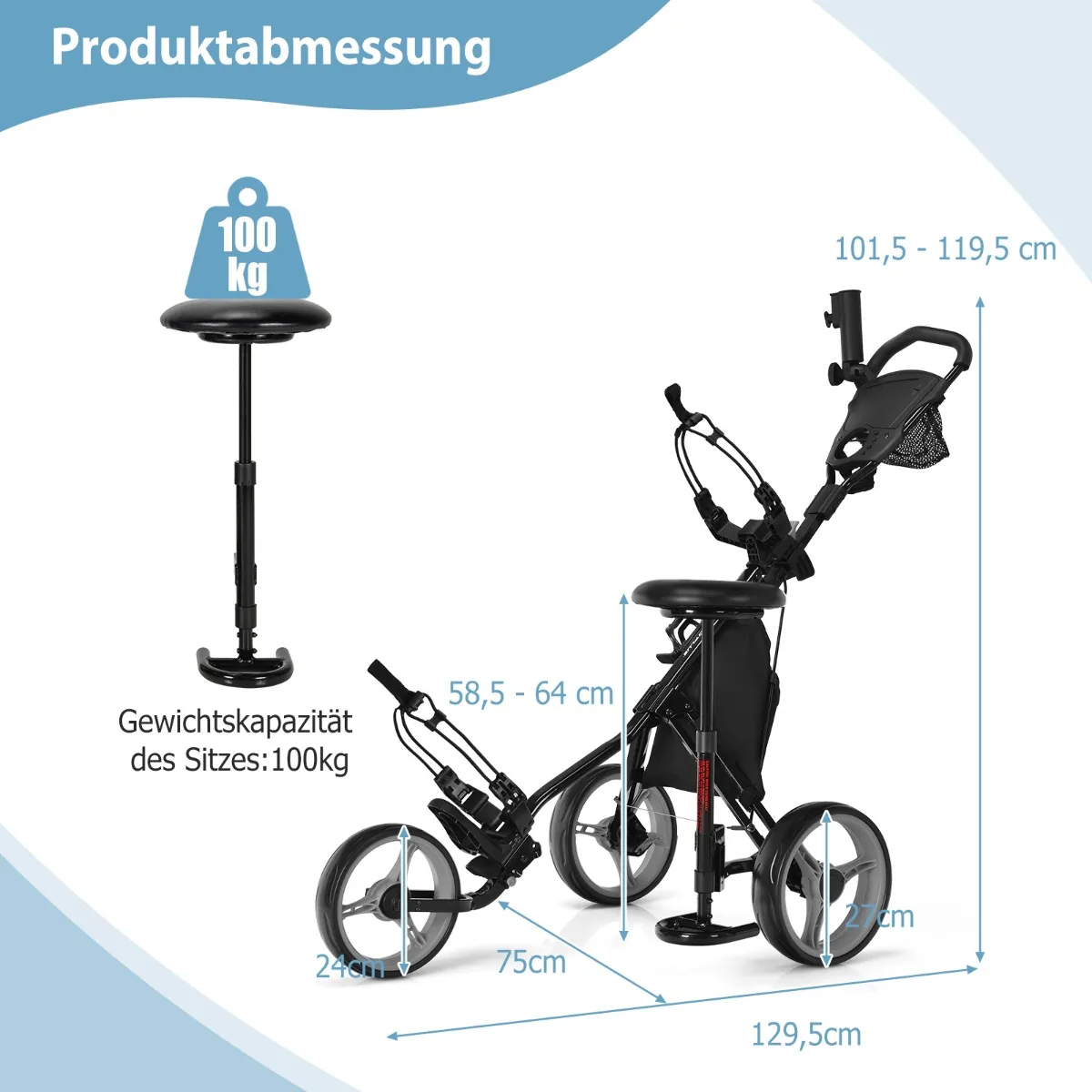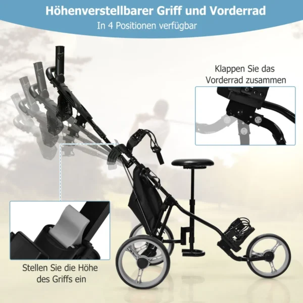 Golfo vežimėlis 129,5x75x119,5 cm, juodos spalvos – patogus ir funkcionalus sprendimas golfo entuziastams. Tvirtas plieninis rėmas užtikrina patikimą krepšio laikymą, o papildomos funkcijos leidžia patogiai transportuoti ir laikyti golfo reikmenis bei asmeninius daiktus.