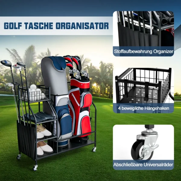 - Krepšys golfo kamuoliukams, 3 lentynos ir 4 pakabinami kabliukai golfo įrangos organizavimui.