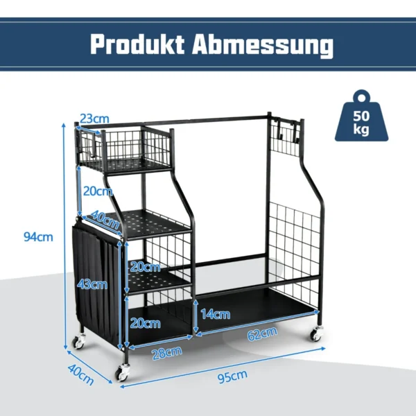 Golfo vežimėlis 95x40x94cm, juodos spalvos, skirtas efektyviai golfo krepšių ir reikmenų laikymui. Patogus ir praktiškas sprendimas golfo mėgėjams, leidžiantis tvarkingai laikyti iki 2 standartinių golfo krepšių ir papildomą įrangą.