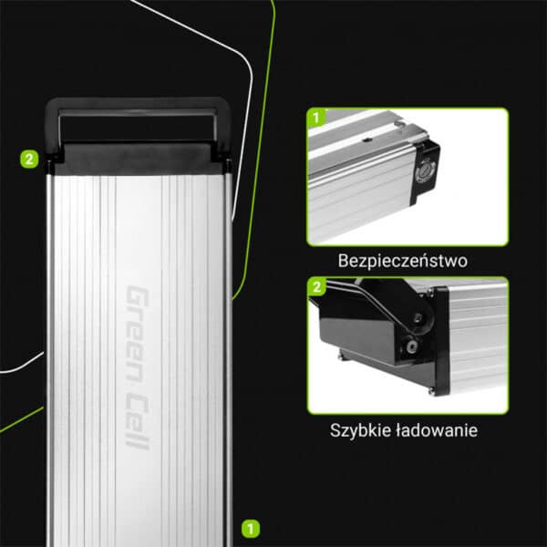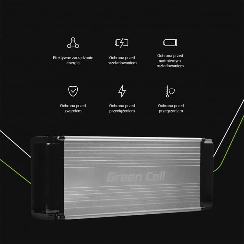 Firminis Green Cell akumuliatorius, skirtas EBIKE, garantuoja patikimumą bet kokiomis sąlygomis Aukštos kokybės GC elementai užtikrina puikų našumą, diapazoną ir didelį patvarumą Moderni valdymo elektronika užtikrina, kad akumuliatorius su dviračiu veiktų be problemų ir saugiai Suderinamas su elektriniais dviračiais: Ecobike Gazelle Giant Yamaha Haibike Kalkhoff Lovelec Prophete Merida ir kt. 12 mėnesių garantija Išėjimas C13 RCA įvestis Green Cell elementų gamintojas Ličio jonų elementų tipas Prekės kodas EBIKE54STD Gamintojas Green Cell Matmenys 35,7 x 14,7 x 6,6 cm AV indikatorius 3 Tūris 3 Tūris 19 cm. Atstumas nuo 35 km iki 70 km Komplekte: Baterija, įkroviklis, saugos rakteliai, rankinis Korpuso tipas Galinis stovas (Bagažas) Varikliui iki 250W