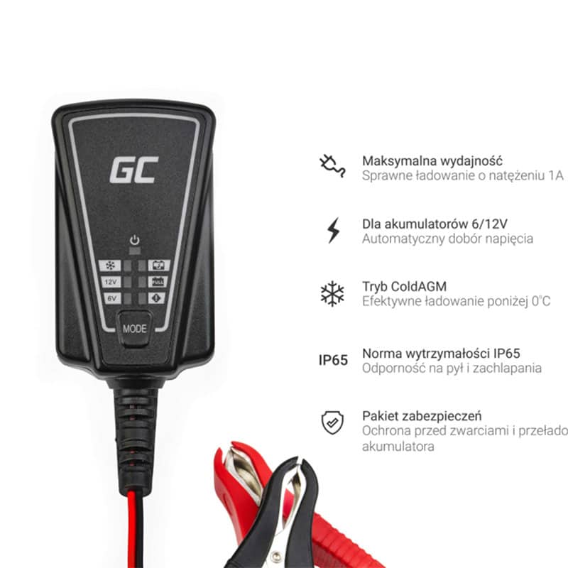 Garantija 12 mėnesių Galia 12W Išėjimas 12V-1A, 6V-1A Spalva Juoda Apsauga nuo perkrovimo Taip Prekės kodas ACAGM06 Gamintojas Green Cell Komplektuojamas Įkroviklis (su spaustukais), vartotojo vadovas Įėjimas 220-240V AC, 50 Hz, 180mA Apsauga nuo trumpojo jungimo atvirkštinio poliškumo Taip