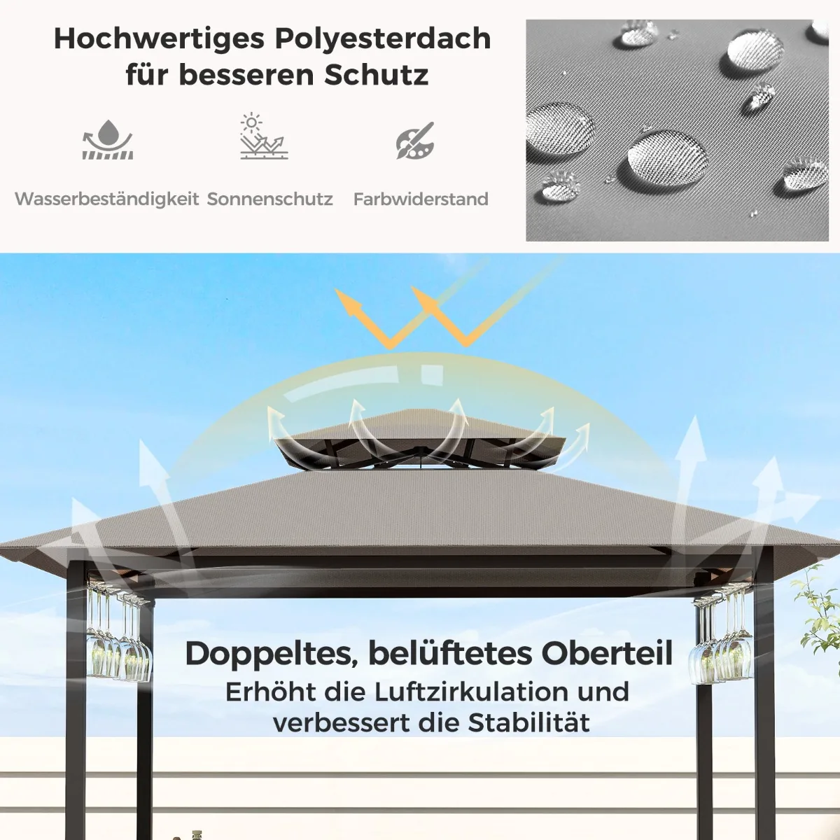 Grilio pavėsinė 194x121x242cm, pilkos ir juodos spalvos, suteikia patogią lauko erdvę kepsninės naudojimui ir poilsiui. Komplektą sudaro tvirta pavėsinė su metaliniu rėmu, baro stalas ir dvi ergonomiškos baro kėdės, pritaikytos įvairioms lauko sąlygoms.