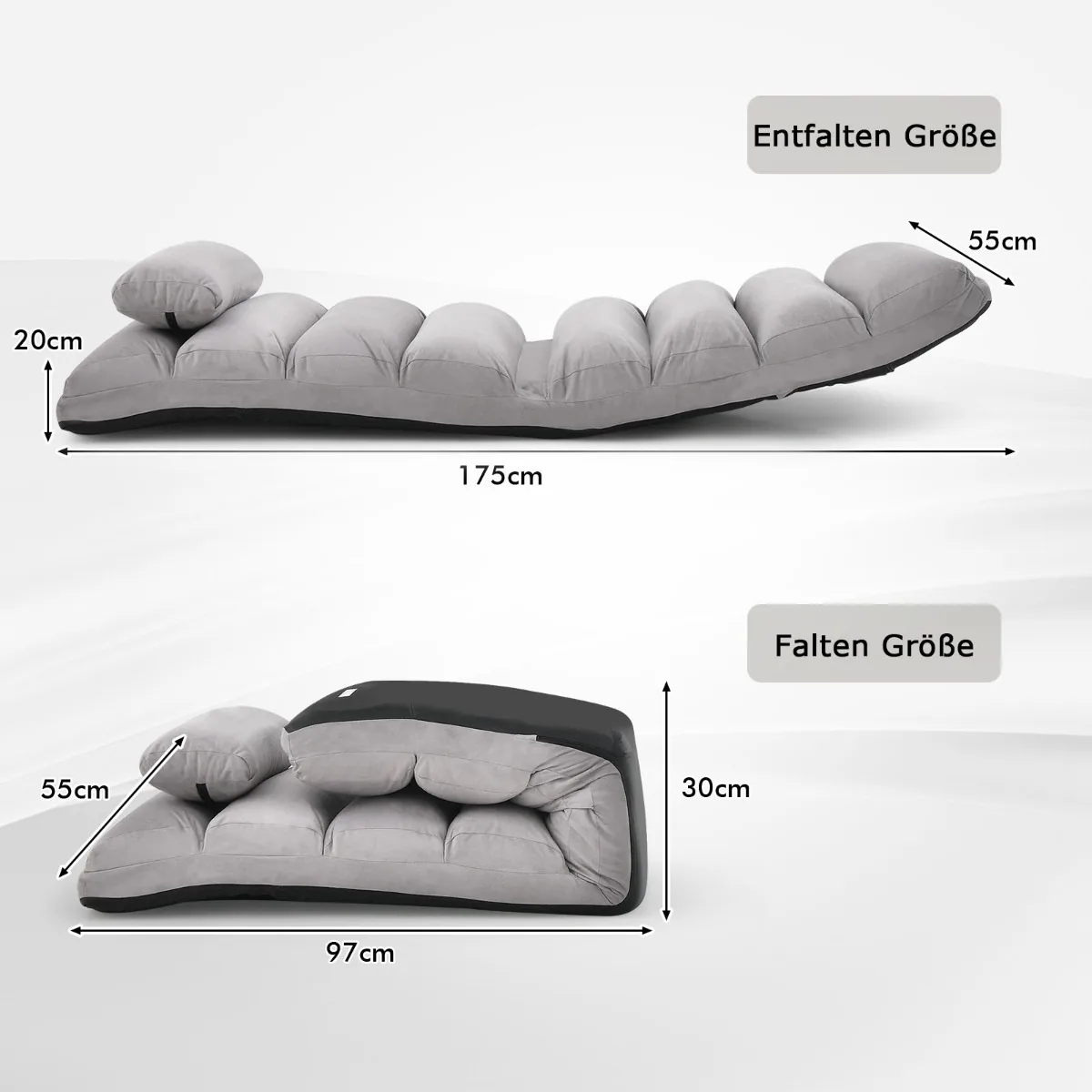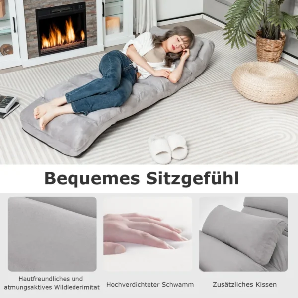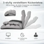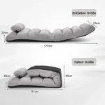 Grindų fotelis 175x55x20cm, pilkos spalvos, suteikia patogią ir funkcionalią sėdėjimo arba poilsio vietą. Dėl reguliuojamo atlošo ir minkštų apmušalų jis pritaikomas įvairiems poreikiams, tokiems kaip žiūrėti televizorių ar ilsėtis. Šis fotelis puikiai tinka naudoti namuose ar kitose laisvalaikio erdvėse.