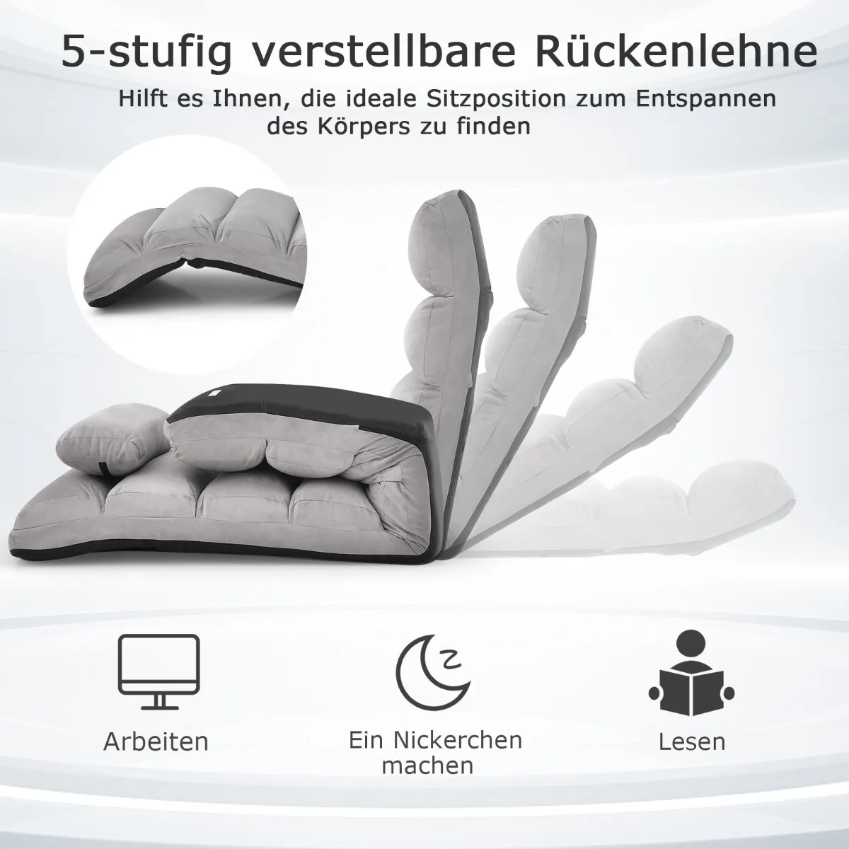 - Grindų fotelis su 5 krypčių reguliuojamu atlošu, leidžiančiu rinktis patogiausią padėtį.