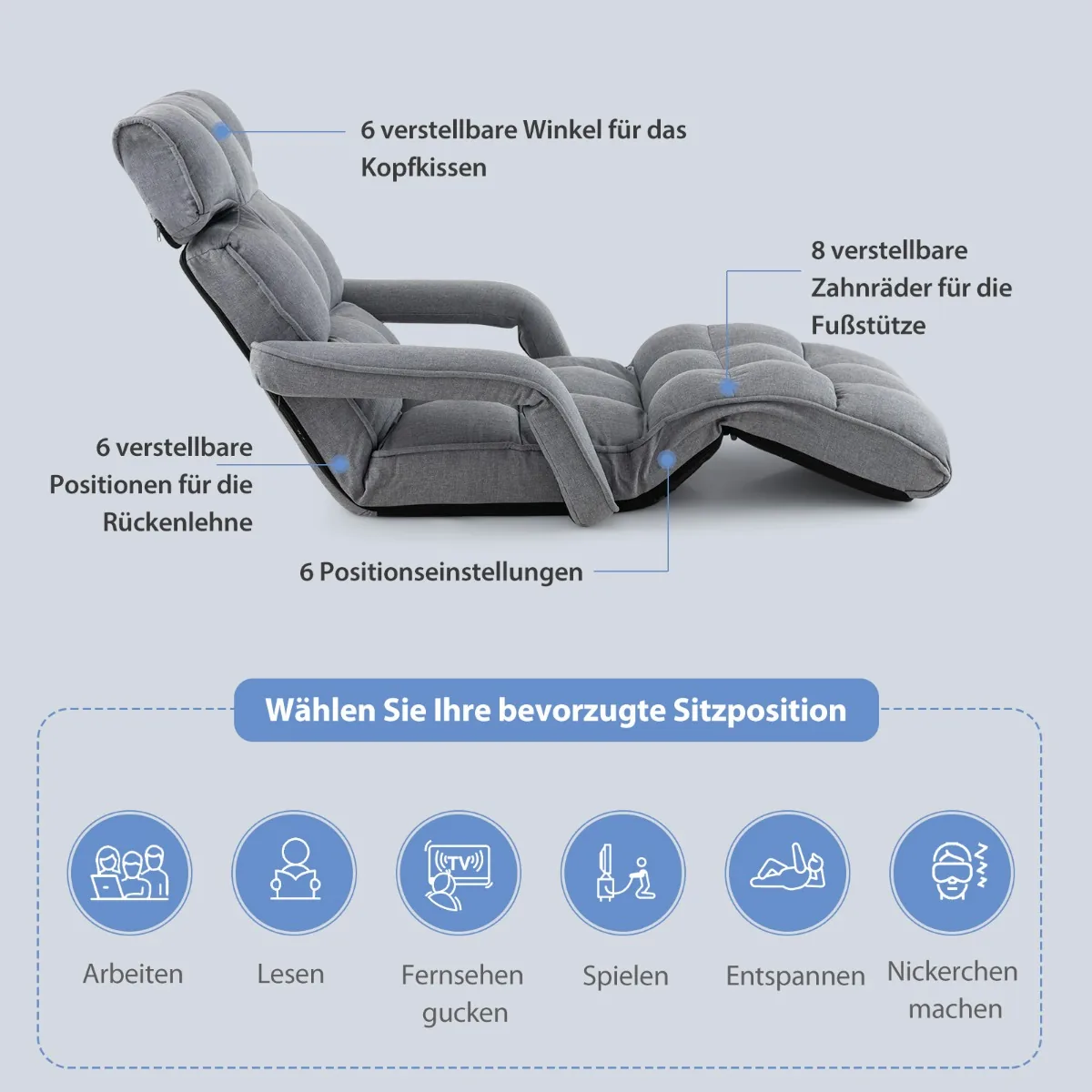 Grindų fotelis 196x72x19,5 cm pilkos spalvos yra reguliuojama sėdimoji baldų dalis, skirta patogiam poilsiui namuose ar biure. Jis puikiai tinka tiek sėdėjimui, tiek miegui, dėl galimybės reguliuoti atlošą, galvos atramą ir kojų atramą. Ergonomiškas dizainas užtikrina tinkamą kūno palaikymą ir komfortą.