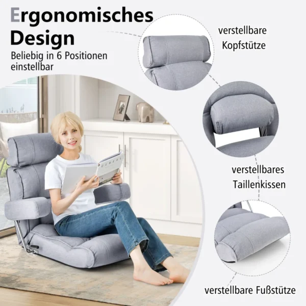 Grindų fotelis 80x72x75cm pilkos spalvos yra patogi ir universali sėdėjimo vieta, tinkama skaitymui, poilsiui ar televizoriaus žiūrėjimui. Šis sulankstomas fotelis pasižymi reguliuojamu atlošu bei pritaikomomis atramomis, užtikrinančiomis komfortą įvairiose padėtyse.