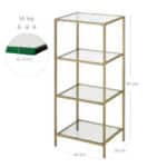 Moderni išvaizda: Stiklas yra modernus, prabangus ir paprastas. Kartu su auksiniu metaliniu rėmu gausite stilingą ir praktišką laikymo lentyną. Padėkite šį elegantišką baldą savo svetainėje, prieškambaryje ar virtuvėje.