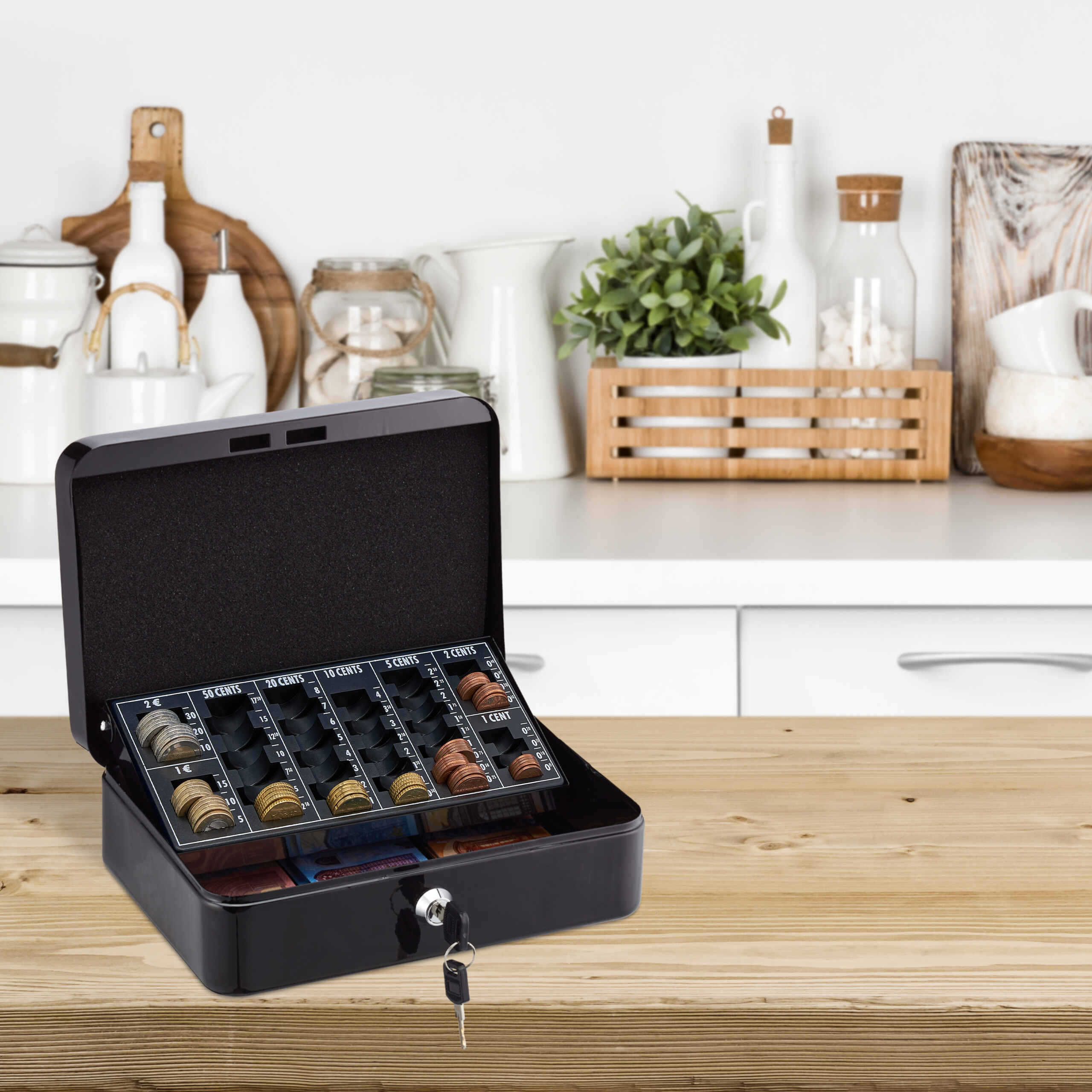 Ieškote patikimo sprendimo grynųjų pinigų saugojimui ir tvarkymui? Mūsų rakinama grynųjų pinigų dėžutė su monetų skaičiavimo lenta yra puikus pasirinkimas tiek namuose, tiek įvairiuose renginiuose, tokiuose kaip sendaikčių turgūs ar mugės.