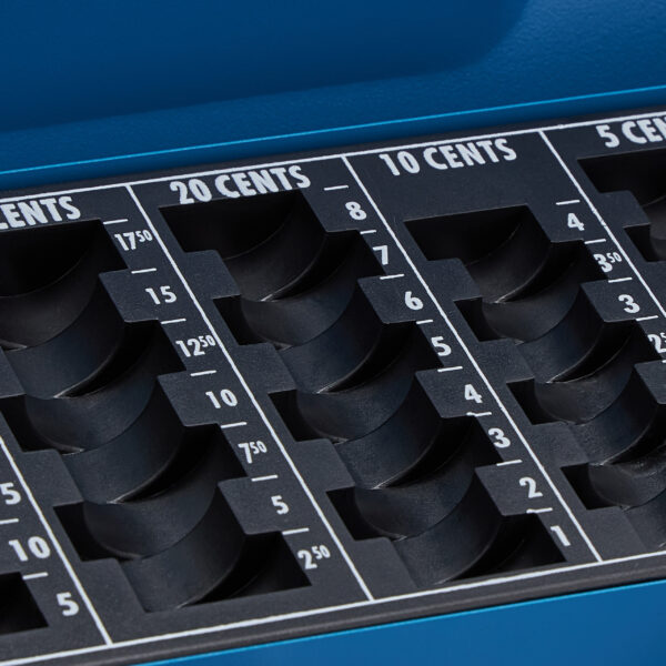 Grynųjų pinigų dėžutė su monetų skaičiavimo lenta, mėlynos spalvos