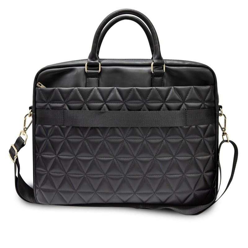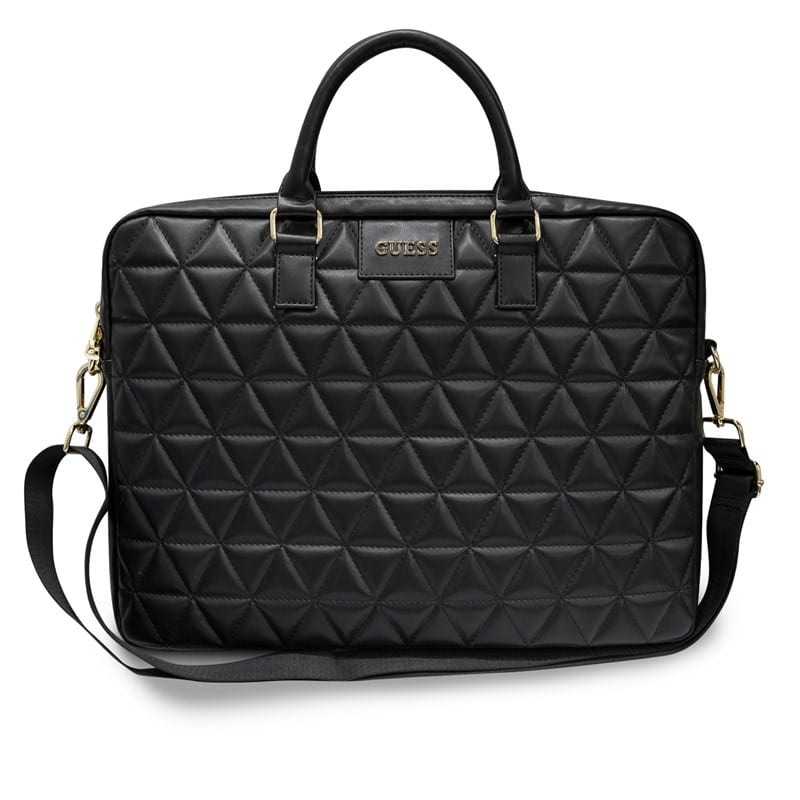 Guess dygsniuotas kompiuterio krepšys 15″ (juodas)Viena pagrindinė dalis ir dvi vidinės kišenės užsegamos bendru užtrauktuku, išorinė kišenė ant paslėptų magnetinių mygtukų. Tekstilinis pečių dirželis ant karabinų. Dvigubos rankenos