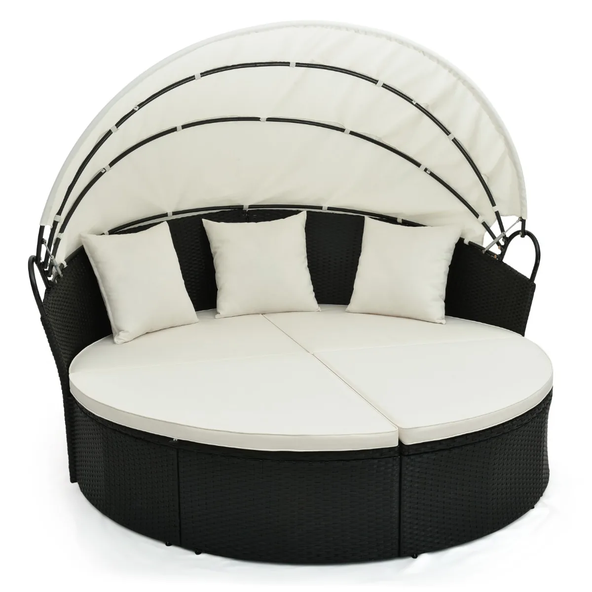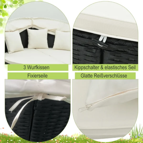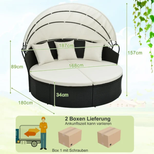 Gultas 187x180x157cm, juodos spalvos, yra skirtas komfortiškam poilsiui lauko sąlygomis. Rotango kušetė su dviem pusmėnulio sofomis ir ištraukiamu stogeliu suteikia daug vietos atsipalaidavimui bei apsaugą nuo saulės.