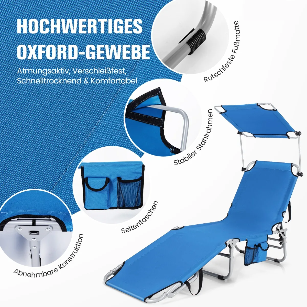 Gultas 193x56x84cm, mėlynos spalvos, skirtas poilsiui lauke. Šis sulankstomas saulės gultas pasižymi reguliuojamu atlošu, besisukančiu baldakimu ir patogia šonine kišene, todėl puikiai tiks terasai, sodui ar paplūdimiui.