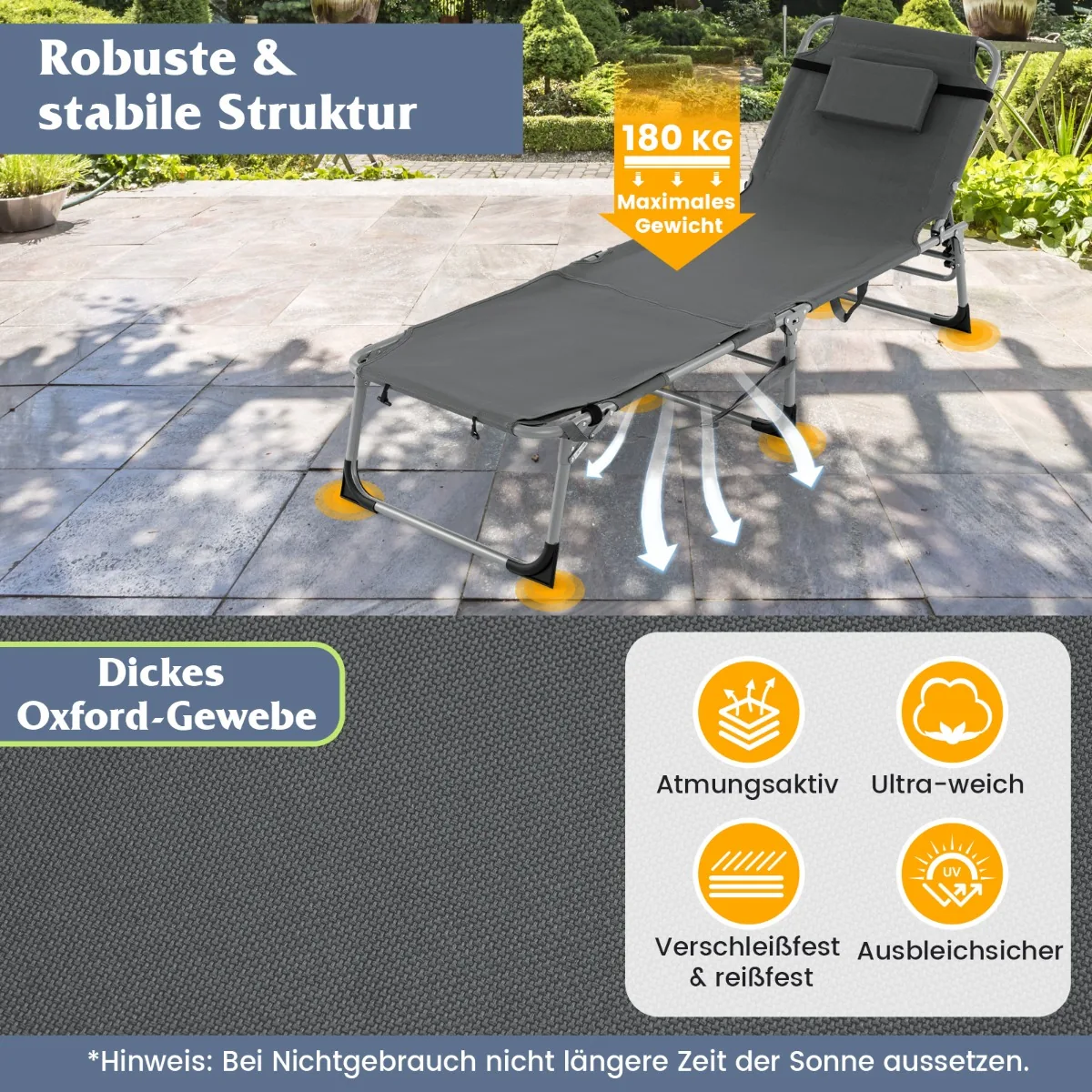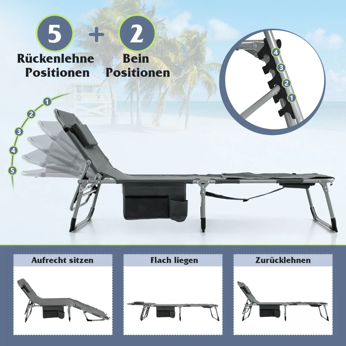 Gultas 194x60x34cm pilkos spalvos – praktiškas ir patogus sprendimas lauko poilsiui. Reguliuojama nugarėlė ir kojų atrama leidžia pritaikyti gultą įvairiems sėdėjimo bei gulėjimo poreikiams. Pilka spalva ir medžiagų derinys užtikrina funkcionalumą bei ilgaamžiškumą naudojant lauke.