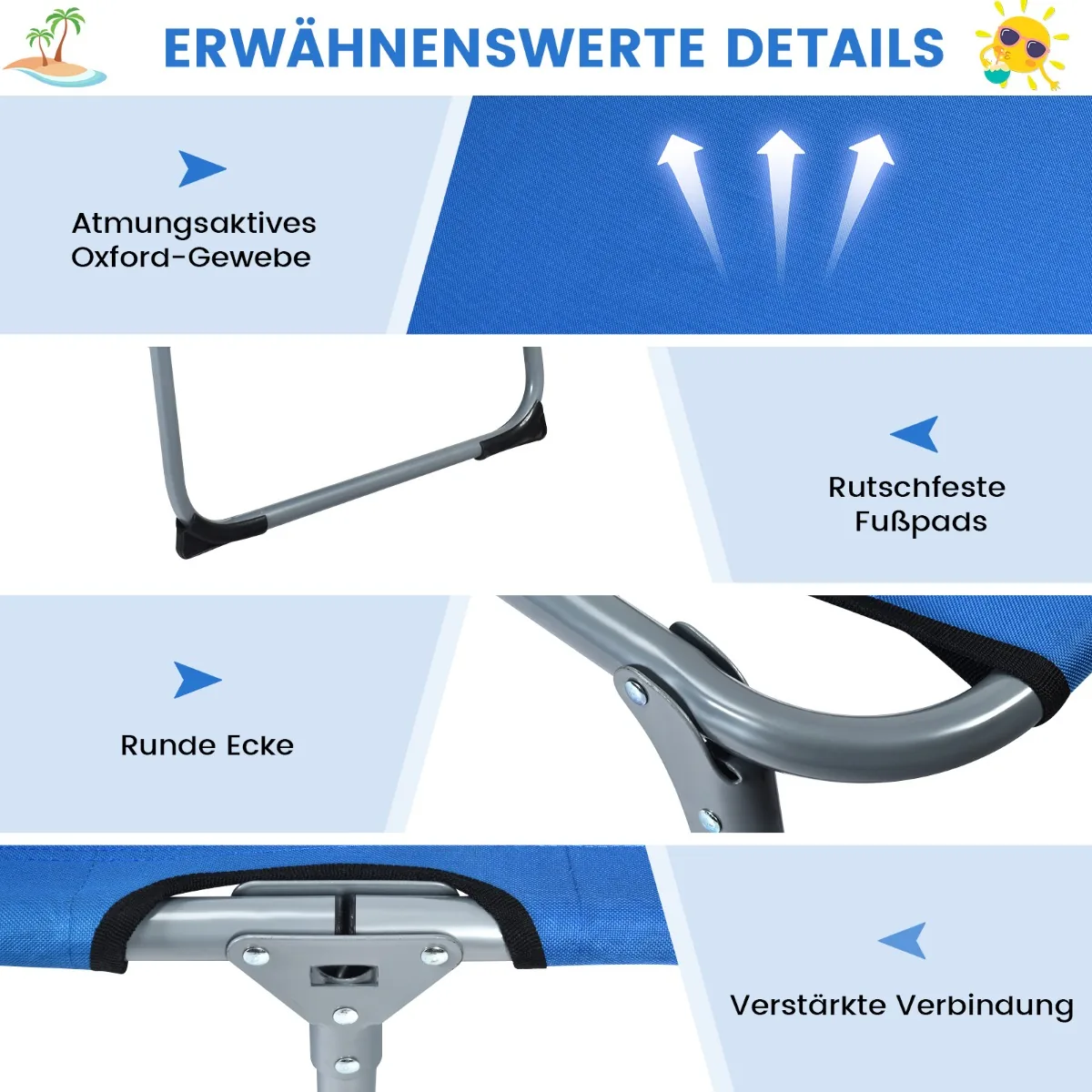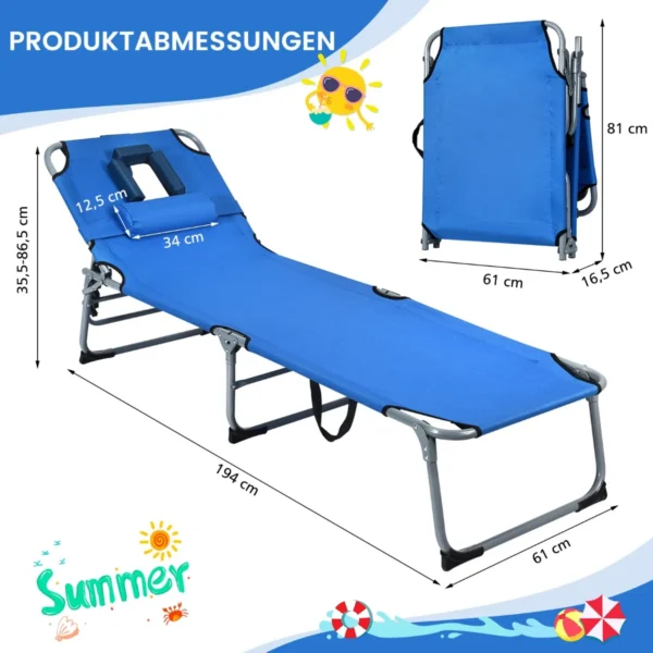 Gultas 194x60x35,5cm mėlynos spalvos yra praktiškas pasirinkimas saulės vonioms, stovyklavimui ar poilsiui namuose. Sulankstomas ir lengvas, jis tinka tiek lauko, tiek vidaus naudojimui. Reguliuojamos pozicijos ir ergonomiškas dizainas užtikrina komfortą įvairioms veikloms.