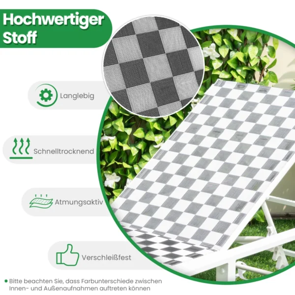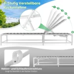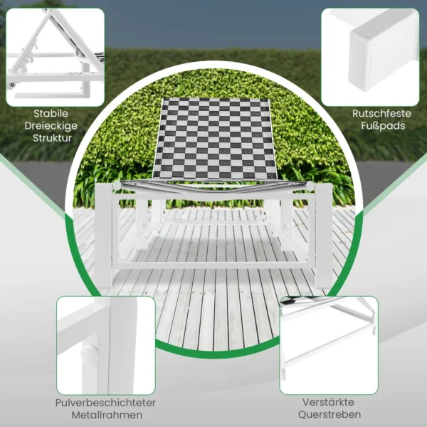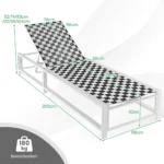 Gultas 200x68x104cm baltos ir juodos spalvos skirtas patogiam poilsiui lauke. Lengvas surinkimas, reguliuojamas atlošas ir ratukai užtikrina gaminio funkcionalumą ir patogumą. Šis lauko gultas puikiai tinka terasoms, sodo erdvėms ar prie baseino.