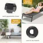 Gultas 207x63x31cm juodos spalvos yra skirtas patogiam poilsiui lauke. Reguliuojamas atlošas ir veido anga suteikia galimybę pasirinkti patogiausią padėtį tiek deginantis, tiek ilsintis. Tvirtas metalinis rėmas ir pralaidus sėdynės audinys užtikrina ilgaamžiškumą ir komfortą naudojant lauke.
