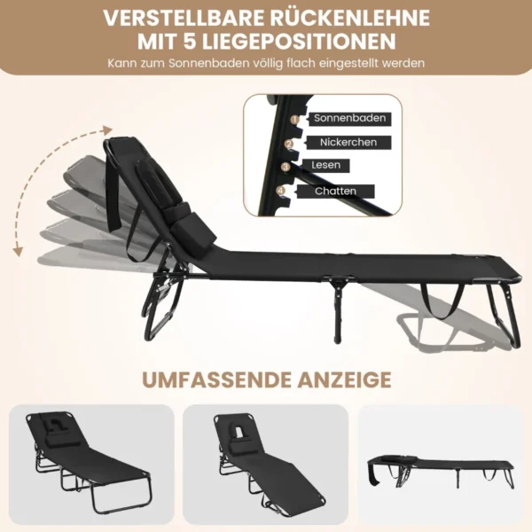 Gultas 63x142x92cm, juodos spalvos, yra patogus pasirinkimas poilsiui lauke ir paplūdimyje. Pagamintas iš tvirto metalo rėmo ir atsparaus Oksfordo audinio, šis gultas užtikrina stabilumą ir ilgaamžiškumą. Reguliuojamas atlošas ir nuimamos pagalvėlės suteikia papildomą komfortą naudojant.