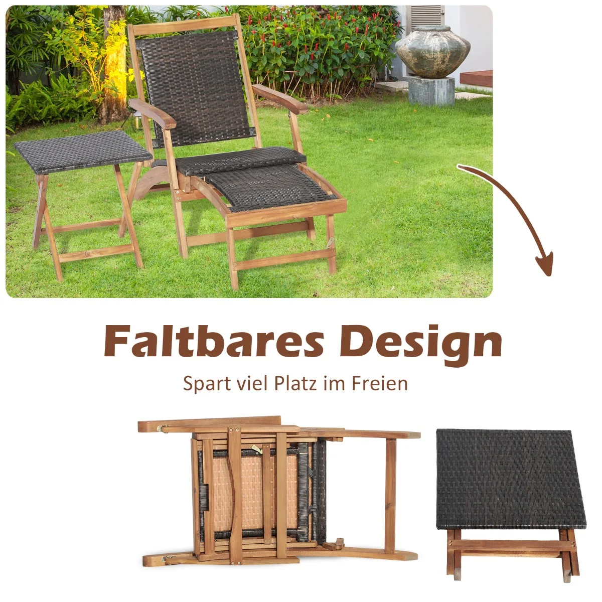 Gultas su staliuku rudos ir tamsiai rudos spalvos yra praktiškas pasirinkimas terasoms, sodams ar baseino zonoms. Sulankstoma konstrukcija ir ištraukiama kojų atrama leidžia patogiai pritaikyti šį lauko baldų komplektą ribotoje erdvėje. Naudojamos medžiagos užtikrina atsparumą aplinkos poveikiui ir ilgaamžiškumą.