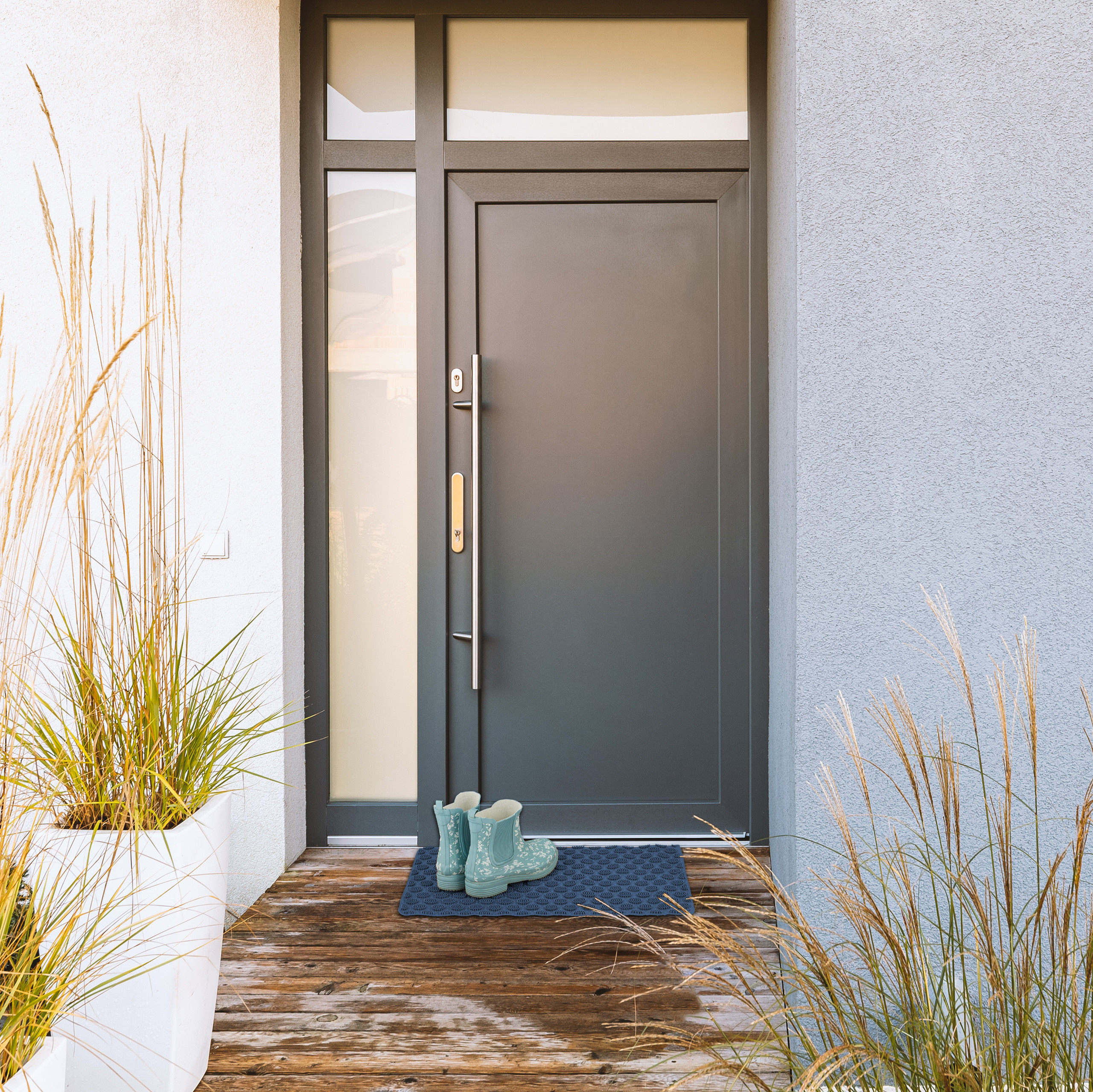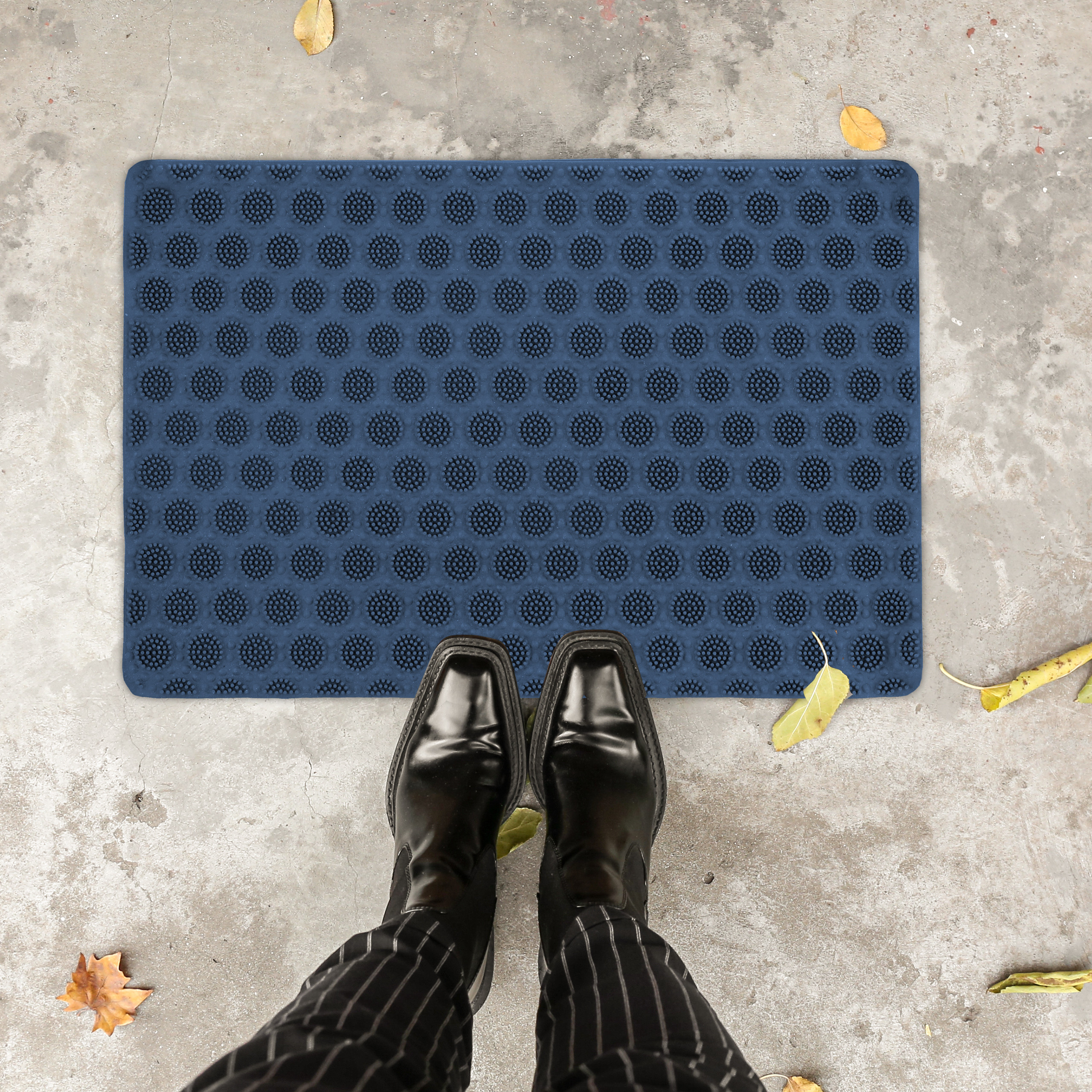 Pasirūpinkite savo namų švara ir stiliumi su šiuo elegantišku mėlynos spalvos guminiu durų kilimėliu. Jo universalus dizainas leidžia jį naudoti tiek viduje, tiek lauke, užtikrinant, kad jūsų grindys visada išliks švarios ir tvarkingos.