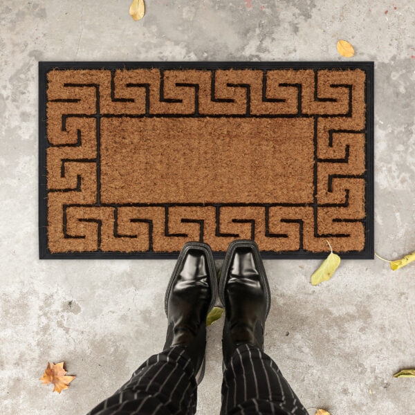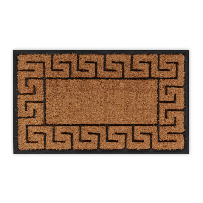 Pristatome jums stilingą ir funkcionalų guminį durų kilimėlį, kuris ne tik užtikrins jūsų namų švarą, bet ir taps elegantišku įėjimo akcentu. Šis kilimėlis, dekoruotas graikiškais ornamentais, puikiai tiks tiek viduje, tiek lauke.