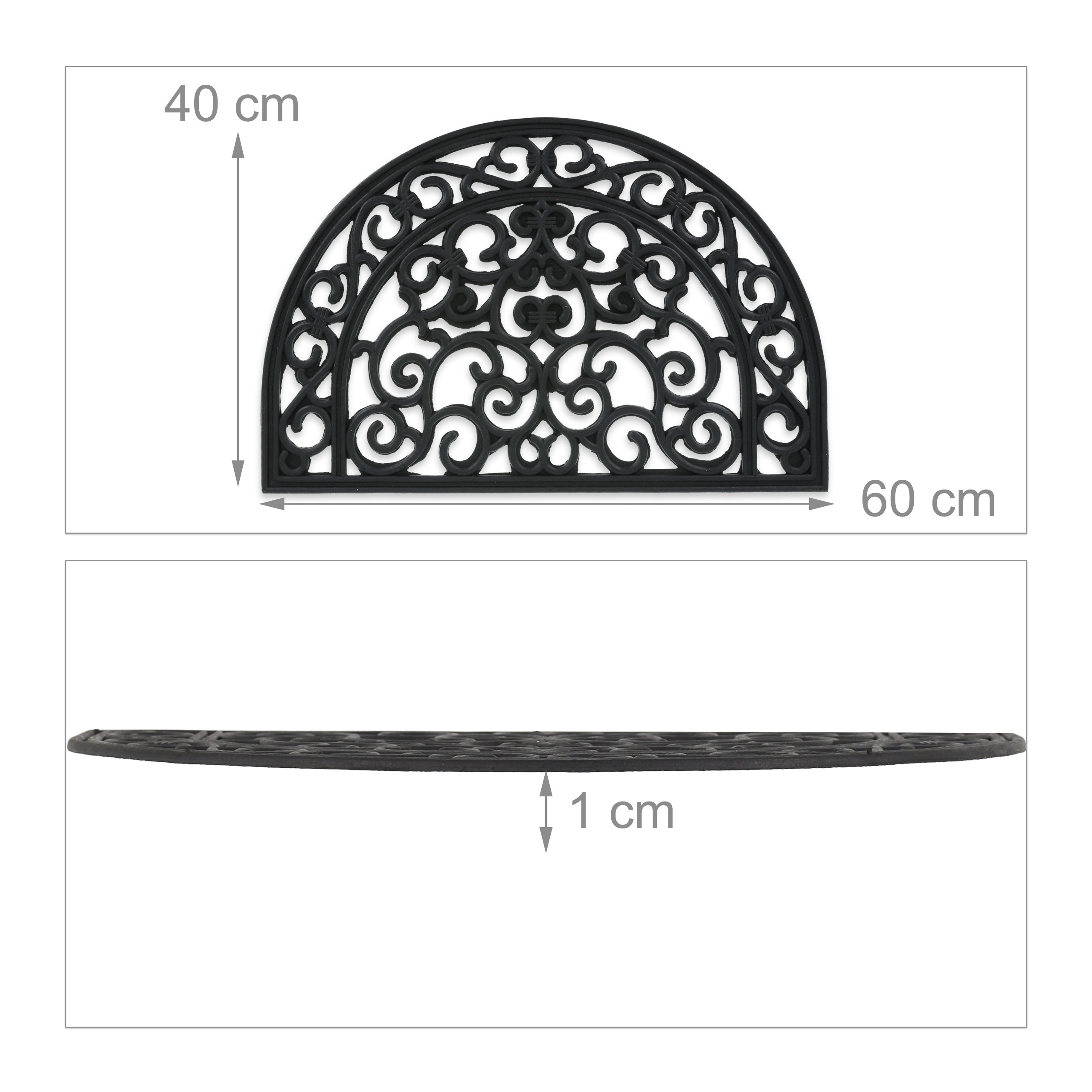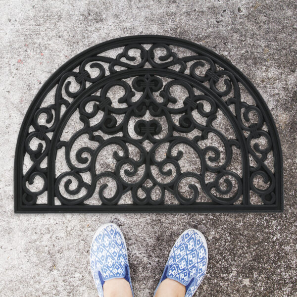 Pristatome jums elegantišką ir funkcionalų guminį durų kilimėlį, kuris ne tik apsaugos jūsų namus nuo nešvarumų, bet ir papuoš jūsų įėjimo erdvę. Šis pusapvalis kilimėlis, pagamintas iš aukštos kokybės gumos, yra puikus pasirinkimas tiek vidaus, tiek lauko naudojimui.