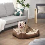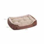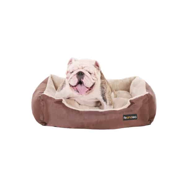 Tvirtas Oksfordo audinys išorėje atlaiko net stipriausius letenų smūgius, o elegantiškas rudas audinys suteikia šunų sofai stilingą išvaizdą. Ryški apverčiama vilnos pagalvė efektyviai kontrastuoja su tamsesne išorinio audinio ruda spalva, suteikdama papildomą estetinį akcentą. Paaukštinti šuns guolio kraštai suteikia jūsų keturkojui saugumo jausmą.