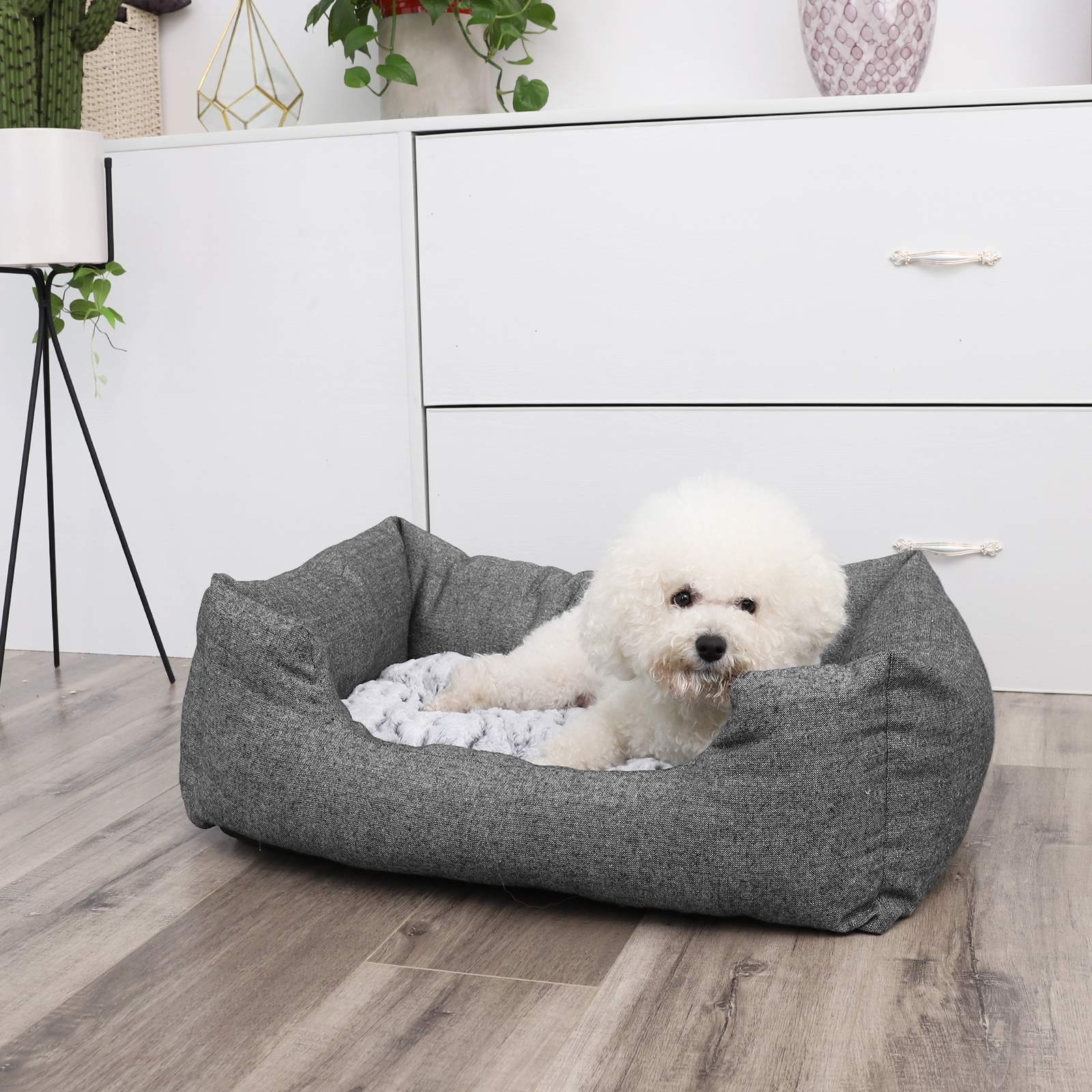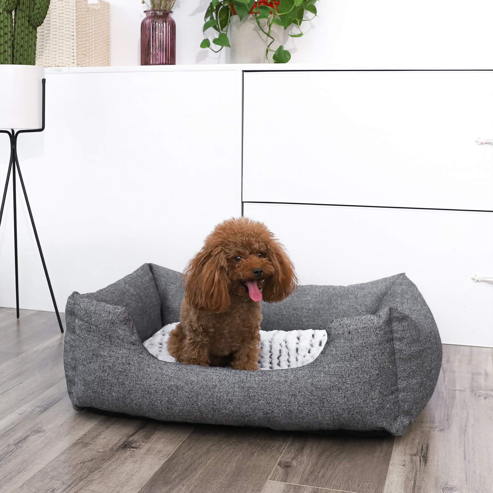 FEANDREA augintinio lova yra puiki miego ir poilsio vieta jūsų mylimam šuniui! Kvadratinė lova gyvūnams pasižymi tvirtumu ir aukšta kokybe. Išorė pagaminta iš tvirto olimpinio audinio, o blizgantys sidabriniai siūlai suteikia daiktui elegantišką išvaizdą. Vidus iš minkšto pūkuoto audinio, kuris užtikrina maksimalų komfortą. Galite apversti pagalvėlę taip, kaip jums patinka, kad jūsų šuo jaustųsi dar patogiau.