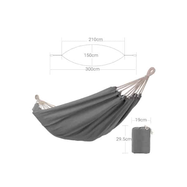 Hamakas pagamintas iš 70% medvilnės ir 30% poliesterio, todėl yra tvirtas ir malonus liesti. Jo dydis yra 210 x 150 cm, o supakuotas jis užima tik 28,5 x 17 cm vietos, todėl jį lengva transportuoti ir laikyti.