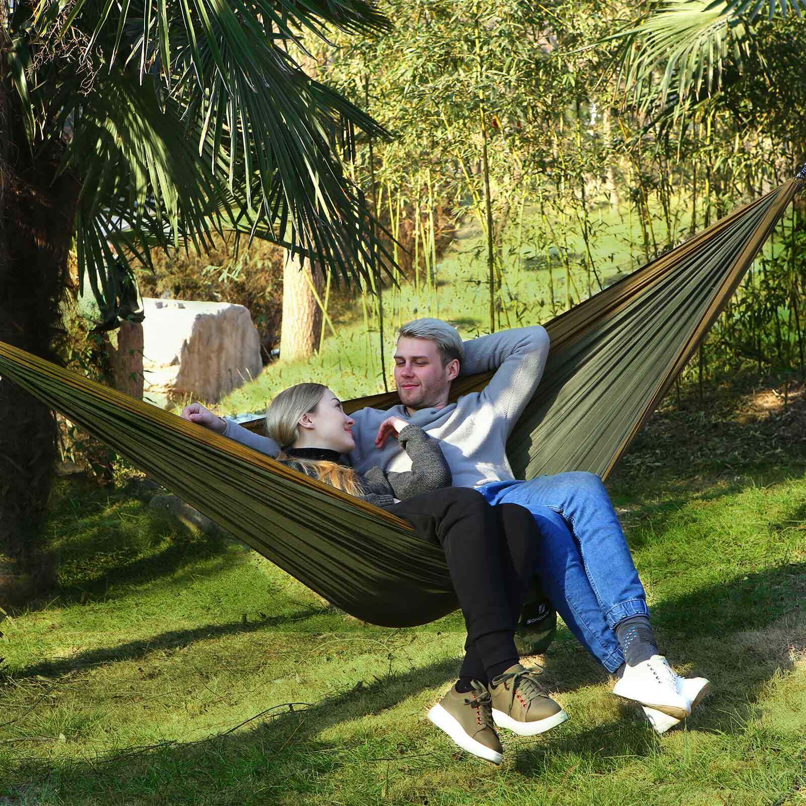 Atsipalaidavimui 2 asmenų hamakas puikiai tinka poilsiui stovyklaujant ar sode. Mėgstantiems keliauti, leistis į keliones į mišką ar kalnus, šis lengvas ir greitai supakuojamas hamakas bus puikus kompanionas, nes užima labai mažai vietos ir su juo galėsite pailsėti akimirksniu.