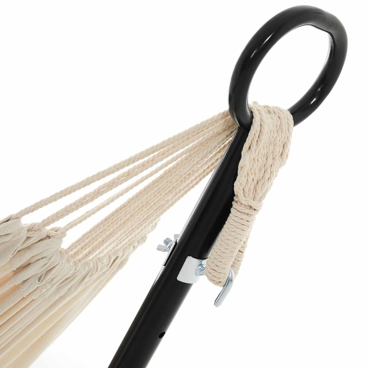 Apsaugokite save nuo rūpesčių: ar vis dar ieškote dviejų tinkamų medžių, prie kurių pritvirtinsite hamaką? O gal net planuojate savo sode pasodinti du medžius? Sustokite! Šiame hamake yra stovas. Jums tereikia skirti kelias minutes šiam hamako komplektui pastatyti ir jūsų sodas akimirksniu pavirs poilsio vieta. Mūsų raktinis žodis – komfortas! Pagamintas iš medvilnės-poliesterio audinio, hamakas yra kvėpuojantis ir patogus. Rėmas yra stabilus ir patikimas, pagamintas iš tvirto metalo. Gulėdami hamake jausitės atsipalaidavę ir laimingi – koks patogus gyvenimas!