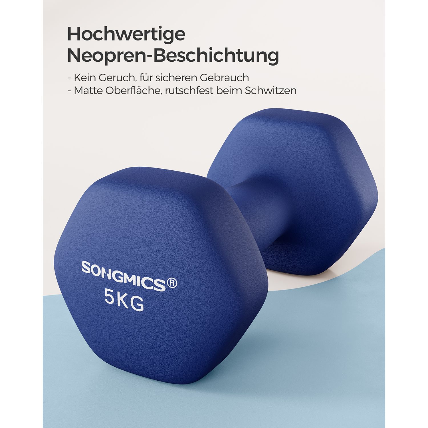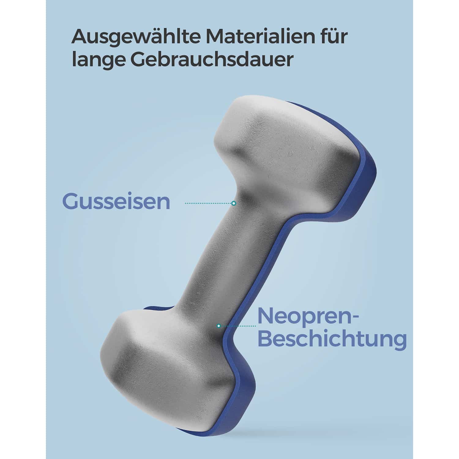 Hanteliai pagaminti iš aukštos kokybės ketaus, padengto neopreno danga, kuri užtikrina tvirtą sukibimą ir apsaugo grindis nuo pažeidimų. Neopreno danga taip pat suteikia papildomą komfortą treniruočių metu.